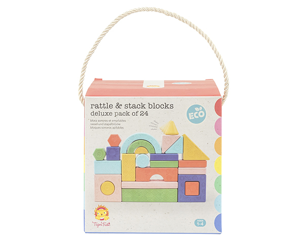 ¡Bloques apilables ecológicos con una diferencia sensorial! Con cada bloque que contiene un sonido de sonajero en el interior, los pequeños se encontrarán con una nueva y deliciosa sorpresa cada vez que tomen uno de los bloques. Además, estos juguetes de aprendizaje sensorial tienen patrones texturizados en el costado, lo que los convierte en una opción ideal para la exploración táctil. Incluye 24 bloques. Este producto forma parte de nuestra nueva Gama ECO creada a partir de bioplástico. Embalaje fabricado con papel certificado FSC. Incluye: 24 bloques musicales hechos de bioplástico