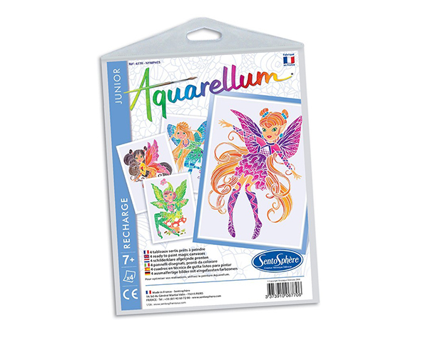 Las ninfas son hermosas deidades asociadas con la naturaleza. ¡Gracias a tu pincel y tu paleta, ayúdalos a encontrar colores vibrantes y crear tus obras más bellas! Unas gotas de pintura y todos los niños podrán crear auténticas obras maestras. Aquarellum Junior es un hobby creativo que te permite crear magníficas pinturas con facilidad y libertad gracias a una técnica única: Papel vitela, grueso y de gran calidad, perfecto para acuarela ya que no se ondula Ilustraciones engarzadas que aparecen como por arte de magia con cada pincelada. De hecho, sólo dejan que la pintura se adhiera a las superficies reservadas. Tintas de acuarela que se mezclan y se superponen para crear degradados sutiles. Una guía detallada sobre la percepción y mezcla de colores. Un concepto y una fabricación francesa. Una actividad manual ideal para iniciar a los niños en el arte enseñándoles a mezclar colores, estimulando al mismo tiempo la imaginación y la concentración. El resultado está garantizado y favorecedor para artistas de todas las edades y niveles, ¡para animarles en la creación! Hay recargas disponibles, así como otros formatos y temas. Juego de 4 cuadros 18 x 25 cm. 1 pincel de acuarela de alta calidad 1 paleta para crear tus gamas de colores 5 botellas de tintas lavables y no tóxicas 1 pipeta para medir tintas