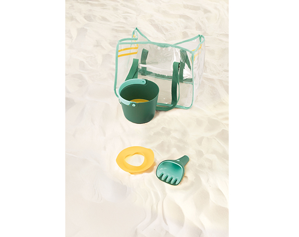 Set de juego con bolsa antiarena que incluye: - 1 Bucki (cubo), - 1 Raki (rastrillo + pala), - 1 Magic Shaper (molde).