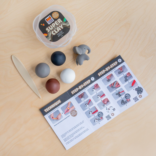 ¡Manitas pequeñas pueden dar vida a grandes ideas con Super Clay! Los niños pueden rodar, amasar y esculpir esta arcilla suave y ligera de secado al aire para explorar un mundo de posibilidades creativas y abiertas; o seguir las instrucciones visuales paso a paso para crear dos personajes súper divertidos. Se seca al aire en menos de una hora, sin necesidad de horno—¡lista para jugar o exhibir! No tóxica y fácil de usar, Super Clay es ideal para el juego sensorial, potenciar la motricidad fina y trabajar la coordinación mano-ojo. Cada set incluye: 4 colores de Super Clay (Púrpuras) Herramienta de modelado de bioplástico Instrucciones visuales paso a paso para crear 2 personajes Contenedor resellable para una diversión sin desorden que dura más