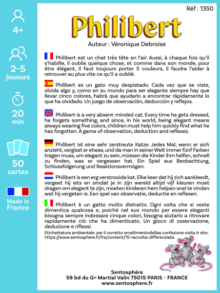 El gato distraído Autora: Véronique Debroise Nuestro gato con botas se llama Philibert, pero es muy despistado. Cada vez que se viste, olvida algo y, como en su mundo para ser elegante siempre hay que llevar 5 colores, habrá que ayudarle a encontrar lo antes posible lo que ha olvidado. Un juego de observación, deducción y reflejos. 88 x 118 x 32 mm