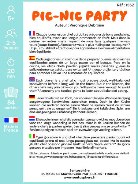 Un juego de toma de riesgos divertido Autora: Véronique Debroise Cada jugador es un chef que debe preparar buenos sándwiches bien equilibrados antes de un largo paseo por el bosque. Pero en la cocina, los otros chefs podrían jugarle alguna mala pasada. ¿Será usted lo suficientemente astuto para esquivarlos? Un juego crujiente y táctico para aprender a llevar una alimentación bien equilibrada. 88 x 118 x 42 mm