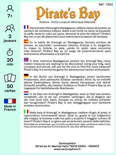 Un juego táctico y de colocación Autor: Victor Lucas En la bahía de Antongil, en Madagascar, conocida por ser un antiguo escondite de piratas, se ocultan numerosos tesoros. Con la ayuda de un bote, una pala, una brújula y un mapa, ¿serás capaz de encontrar los tesoros más valiosos y asumir los riesgos necesarios para ello? Un juego de colocación y táctica para pequeños y grandes. 88 x 118 x 32 mm