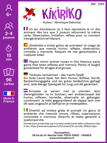 Un juego de imitación Autora: Véronique Debroise Un juego que hará reír a pequeños y grandes al reproducir el grito de los animales cada vez que aparezcan 2 cartas iguales al mismo tiempo. Un juego con varios niveles de dificultad según la edad, para no aburrirse nunca y desarrollar los reflejos. 88 x 118 x 42 mm