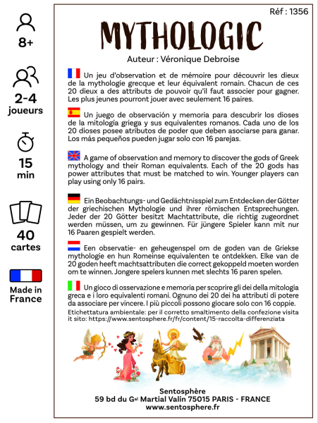 Un juego de observación y memoria Autora: Véronique Debroise Un juego cooperativo de observación y memoria para descubrir los dioses de la mitología griega y su equivalente en latín. Así, se aprende que Artemisa y Diana son la misma, y que Afrodita no es otra que Venus. Cada uno de estos 20 dioses tiene atributos de poder que hay que asociar para ganar. Para los más pequeños, se puede jugar con solo 16 parejas. 88 x 118 x 32 mm