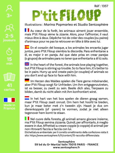 Un juego de observación y asociación. Un lobo está solo en el bosque porque nadie quiere jugar con él. Sea cual sea la estación y su tamaño, los animales se esconden para evitarlo por miedo a que se los coma. Pero ¿quién se quedará solo con él? Un juego para enseñar a los niños a formar parejas con algunas sutiles diferencias. Para los más pequeños se jugará con solo 33 cartas, mientras que los mayores podrán jugar con 41 cartas llenas de frescura y humor. 88 x 118 x 32 mm