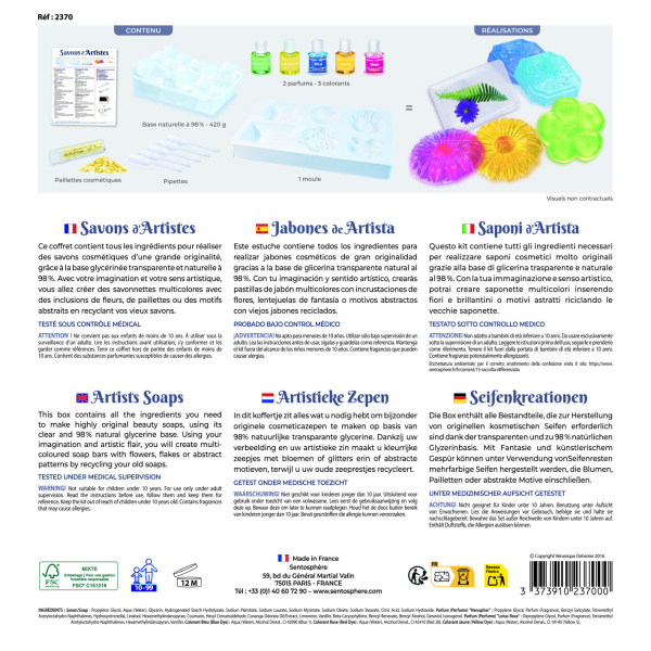 ¡Crea bonitas pastillas de jabón para el uso diario con una base que respeta el pH de la piel, esa es la promesa de este kit! La base de jabón se funde en el microondas o al baño maría, se puede perfumar y colorear antes de verterla en uno de los 6 moldes del kit. La transparencia del jabón glicerinado realzará los colores de pétalos de flores, copos de nieve o hojas de roble. Además, la base permite reciclar viejas pastillas de jabón para darles una segunda vida. Contenido: 420 g de base de jabón glicerinado natural 98 % 2 fragancias y 5 pipetas Purpurina biodegradable 3 colorantes cosméticos 1 molde con 6 cavidades 1 folleto de instrucciones Edad recomendada: 10+ Volumen: 285 × 285 × 40 mm Peso: 860 g
