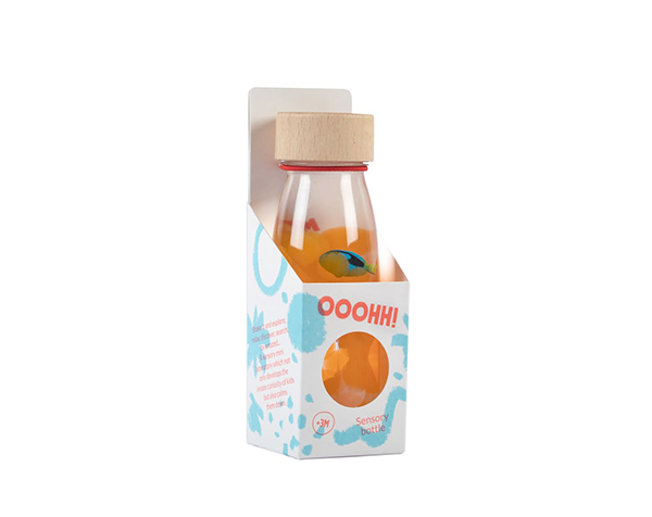 ¿Conoces la sensación de caminar por el lecho del mar? Puedes ver cómo la arena se levanta a través de las aguas turquesas y la relajación te inunda Hemos querido recrear esa sensación para los más pequeños con esta nueva botella, con un sonido y un efecto tan hipnótico que no podrán dejar de jugar con ella. Conchas, arena, bolas de hidrogel y un curioso pez azul les esperan en los arrecifes. Mirar, agitar ¡y escuchar! Tan simple y tan efectivo como eso. Los pequeños objetos de la serie SOUND BOTTLE son un auténtico espectáculo para los más pequeños. A la identificación visual de las piezas contenidas se une la estimulación auditiva, especialmente importante en el primer año de vida de los bebés. Ayuda en el aprendizaje de la discriminación de sonidos: de los más suaves a los más fuertes, asociando cada sonido a un significante. Estimula la motricidad gruesa: apilando las botellas, agitándolas, haciéndolas rodar Dimensiones de cada botella: 14 x 4 cm. No sumergir en agua ni exponer al sol durante largas horas. Para su higiene aconsejamos pasar una toallita o trapo húmedo. +3 meses