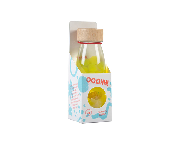 ¿Hay algo más relajante que contemplar una pecera? Pues sí: jugar con nuestra nueva sound bottle. Los niños sentirán la paz del fondo del mar mientras observan cómo el pez globo amarillo flota entre corales y arenas. El sonido de esta botella es suave e hipnótico, con el efecto irresistible que hacen las bolas de hidrogel cuando las agitas. Mirar, agitar ¡y escuchar! Tan simple y tan efectivo como eso. Los pequeños objetos de la serie SOUND BOTTLE son un auténtico espectáculo para los más pequeños. A la identificación visual de las piezas contenidas se une la estimulación auditiva, especialmente importante en el primer año de vida de los bebés. Ayuda en el aprendizaje de la discriminación de sonidos: de los más suaves a los más fuertes, asociando cada sonido a un significante. Estimula la motricidad gruesa: apilando las botellas, agitándolas, haciéndolas rodar Dimensiones de cada botella: 14 x 4 cm. No sumergir en agua ni exponer al sol durante largas horas. Para su higiene aconsejamos pasar una toallita o trapo húmedo. +3 meses