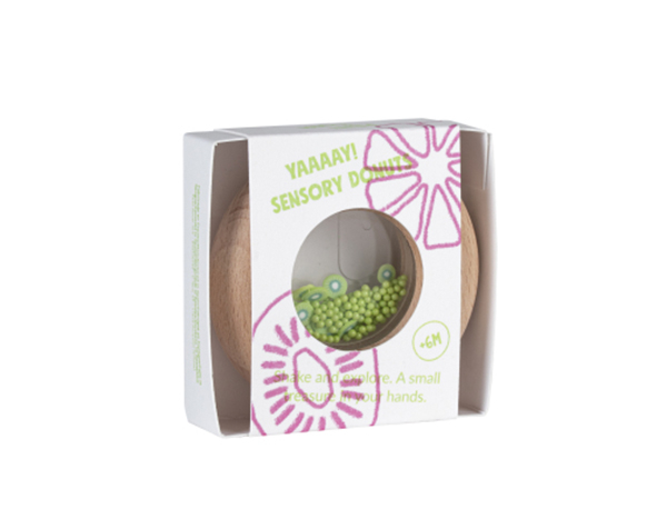 Nuestro nuevo juguete sensorial encantará a los pequeños más golosos. Es un sonajero de madera con forma de donut, ideal para que sus manos lo manipulen con comodidad. En su interior, podréis identificar figuras de frutas y verduras, que al agitarse desatan el irresistible sonido marca de la casa. Aunque apetece comérselo, está hecho de madera de haya natural, libre de tóxicos y a prueba de mordiscos. Dimensiones de cada donut: 7 X 2 cm Peso: 46 gr No sumergir en agua ni exponer al sol durante largas horas. Para su higiene, aconsejamos pasar una toallita o trapo húmedo. +6 meses